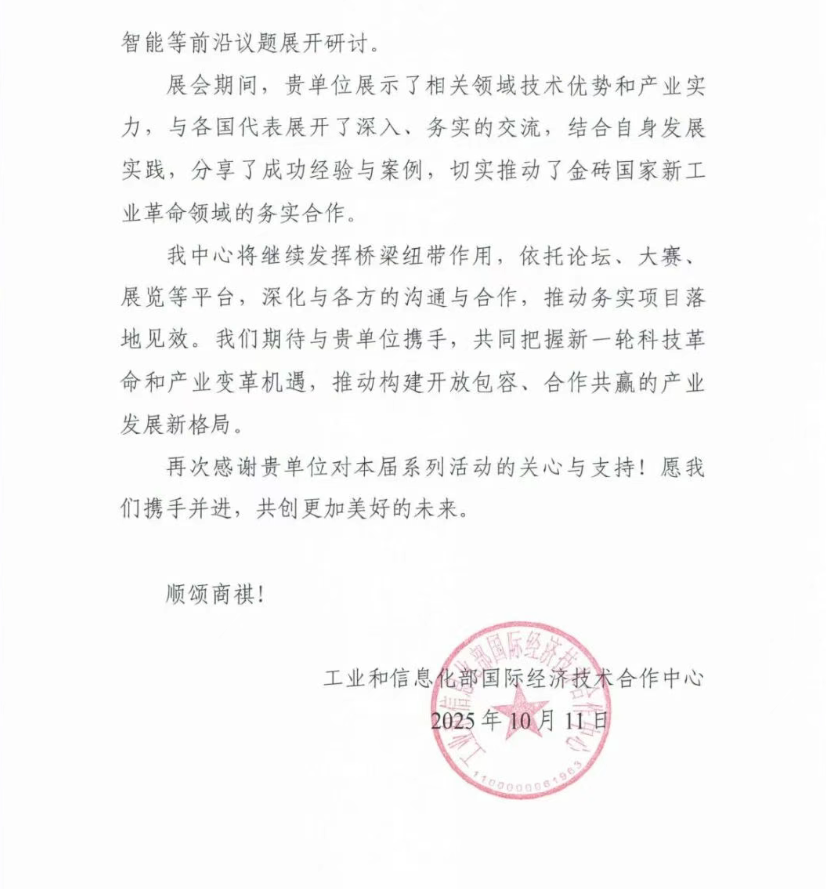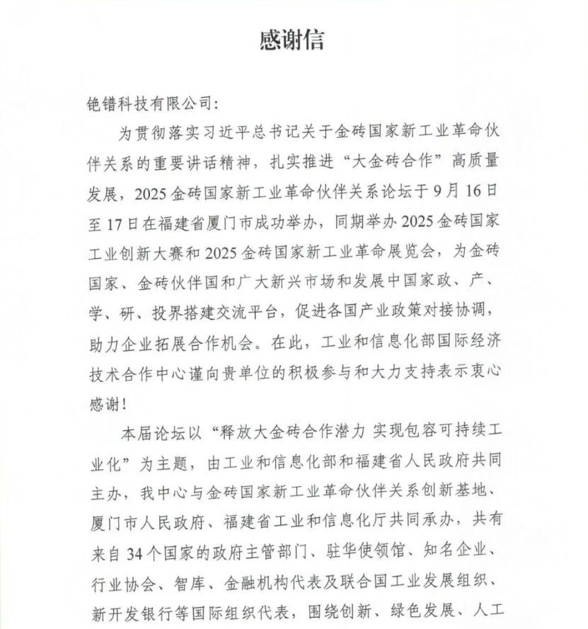 近日,工业和信息化部国际经济技术合作中心向铯镨科技有限公司发出感谢信,对公司在“2025金砖国家新工业革命伙伴关系论坛”及相关活动中的积极参与和大力支持表示衷心感谢。