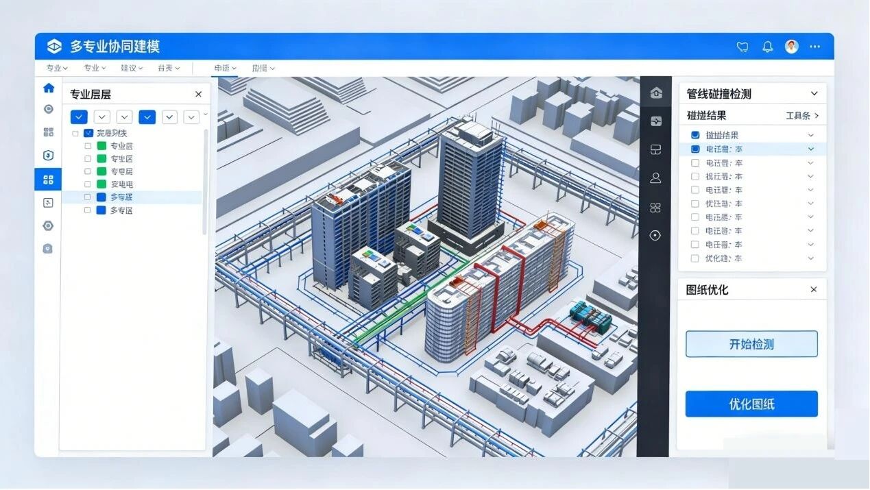 多专业协同设计:传统设计模式中,建筑、结构、机电(给水、排水、电气、暖通)等各专业独立出图,因沟通不畅极易出现 “管线碰撞”“结构冲突” 等问题,后期施工中不得不通过凿墙、改管等方式整改,造成大量成本浪费。而 BIM 技术能实现多专业在同一数字化平台协同建模,设计变更实时同步,从源头规避各专业之间的设计冲突